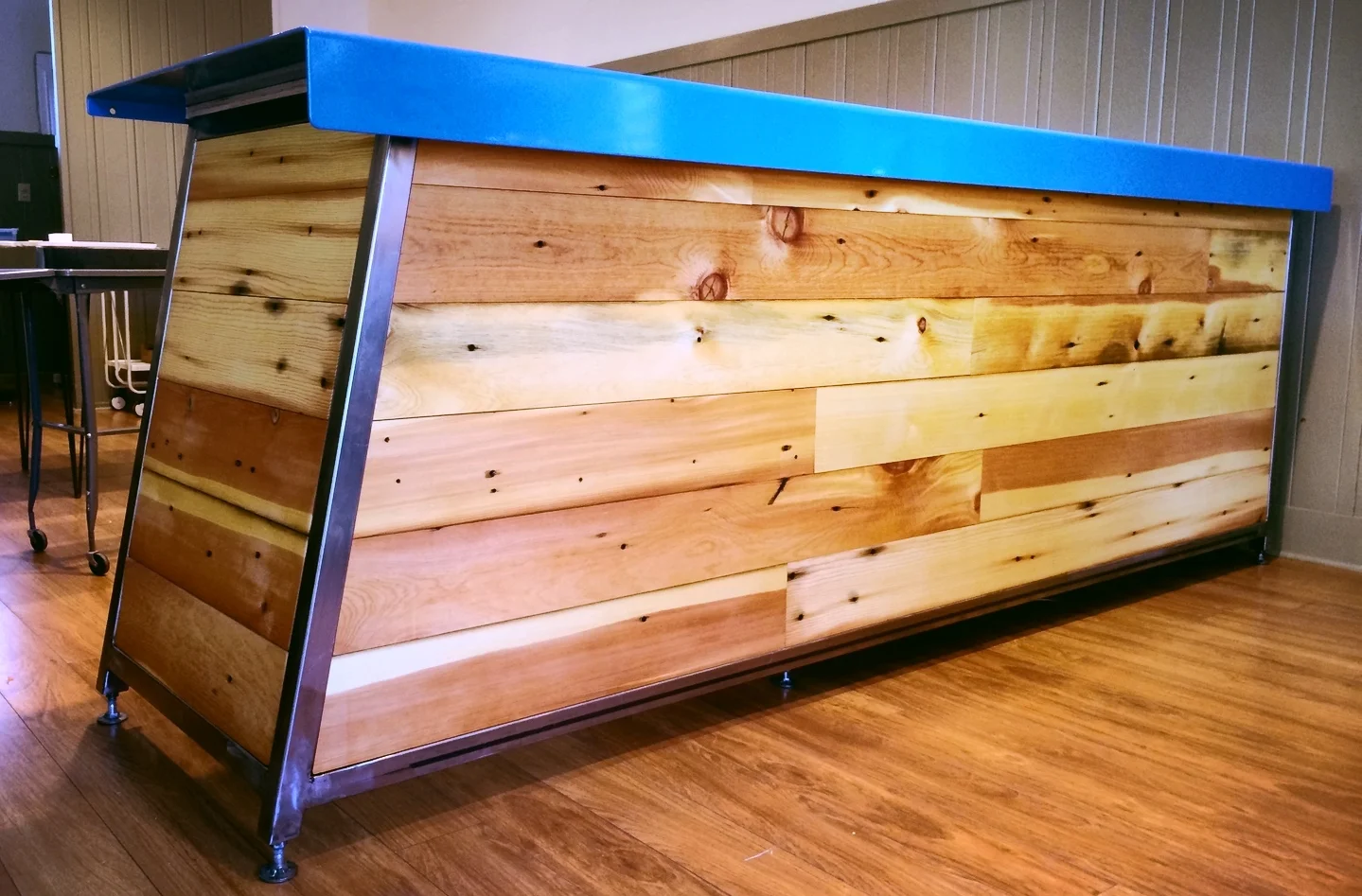 This beautiful table is made from reclaimed floor joists from a 1920's remodel in Seattle's Queen Anne neighborhood. It has a custom steel base with a wood stringer. It's being delivered raw and unfinished, to be pre-assembled by the client. The resident plans to use this 10-foot farm table as the anchor piece in their kitchen, dinning room. It's a beauty!